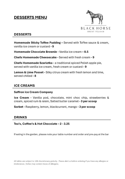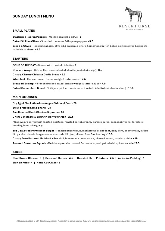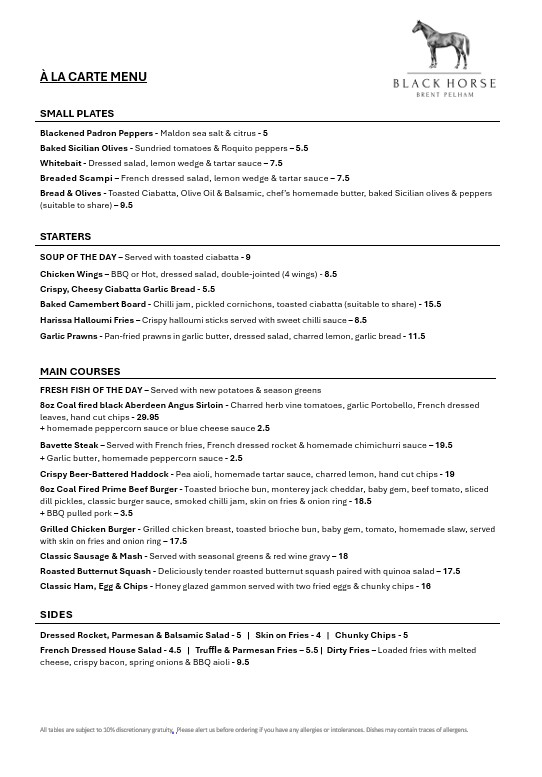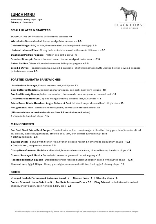 Please note, the following menus are an example preview of what one can expect when dining at The Black Horse. These menus are subject to change. If you would like more information, please contact us directly.